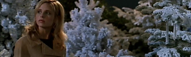 Buffy, who invited and ordered Faith to watch Joyce, finds Angel atop the hill behind the mansion, awaiting sunrise. However, the heat wave from which Sunnydale has been suffering abruptly ends and the first flakes of snow start to fall. With the weather report saying the sun should not be expected to be seen at all that day, Buffy and Angel take a walk through the town in silence.