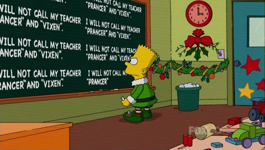 - "Miracle on Evergreen Terrace" - Bart has the starring role again in the show's third Christmas episode. After Marge decrees that the family is not to open their Christmas presents until after 7 AM and confiscates the alarm clocks, Bart drinks a dozen glasses of water on Christmas Eve so that he will have to get up to use the bathroom early. Sure enough, after getting up at 5 in the morning, he goes and opens his presents, one of which is a remote-controlled fire truck called the Inferno Buster 3000. However, as he's playing with it, the toy lives up to its name when it crashes into the tree, setting it and the presents on fire. Bart manages to extinguish the fire before it spreads any further and then buries the burnt evidence under the snow in the front yard. When the rest of the family wakes up, Bart tells them that a burglar made off with the tree and presents. When the police come to investigate, local reporter Kent Brockman reports about the "burglary" on the news, leading everyone else in Springfield to give the Simpsons a new tree and donate $15,000 (which Homer spends a new car that he then drives into a lake). Bart eventually confesses to his family what really happened, and while they try to maintain the lie during a follow-up report, Santa's Little Helper digs up the burned tree. This angers everyone else in Springfield, who now believe they were scammed, and they demand to be repaid the $15,000; it's only after they all rob the Simpsons' house that the family is finally forgiven.