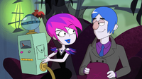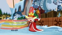 Their first plan is to trick the Glooms into believing that they have all of the joy by using the Joybuster on two makeshift Bashful and Happy mannequins next to a table, with the real dwarfs giving out voices underneath them. The next plan involves Happy singing in an attempt to uplift the 7D's dull spirits at the cottage and then lead them and the villagers to the huge Jollywood Tree. Hildy can't believe that she was fooled, and the Glooms go back to use the Joybuster on Happy. But this is even more difficult than Delightful's -- Happy's joy is so big that it overloads the machine, causing it to explode, and all the joy cascades over the sky, returning it to everyone. As everybody gathers around the tree feeling happy again, even Grim and Hildy find joy inside themselves—though Hildy finds it gross.