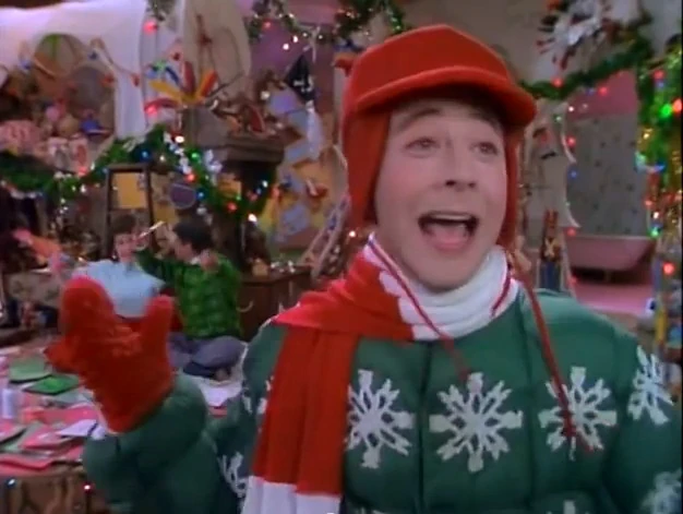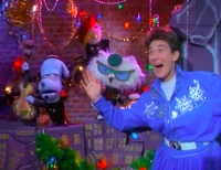 After that, Billy Baloney decides to sing on the Christmas special, when Pee-wee reminds him maybe next year. Then outside, Mr. Kite announces that it's snowing. Pee-wee, reacting excitedly, puts on his winter outfit, leaving a jealous Frankie and Annette to continue working with cards. Out in the snow, Pee-wee makes a snow angel and makes mystery tracks. When Cowboy Curtis comes by and wonders who made those footprints, Pee-wee surprised him, saying he made his mystery tracks. Then they hear the Del Rubio Triplets singing "Winter Wonderland".