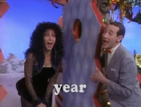 After a break, Pee-wee shows us his next guests - Frankie Avalon and Annette Funicello, making Christmas cards by stamping many Christmas trees and candy canes on them. Pee-wee commands them to make 500 of them before sundown. Next, Pee-wee sees Cher decorating Conky like a Christmas tree. It reminds Pee-wee that he forgot to get today's secret word, so Conky displays it - year. After he explains the secret word rules, he asks Cher how she likes Christmas so far. Cher: "Christmas is my favorite time of year". Everyone screams.